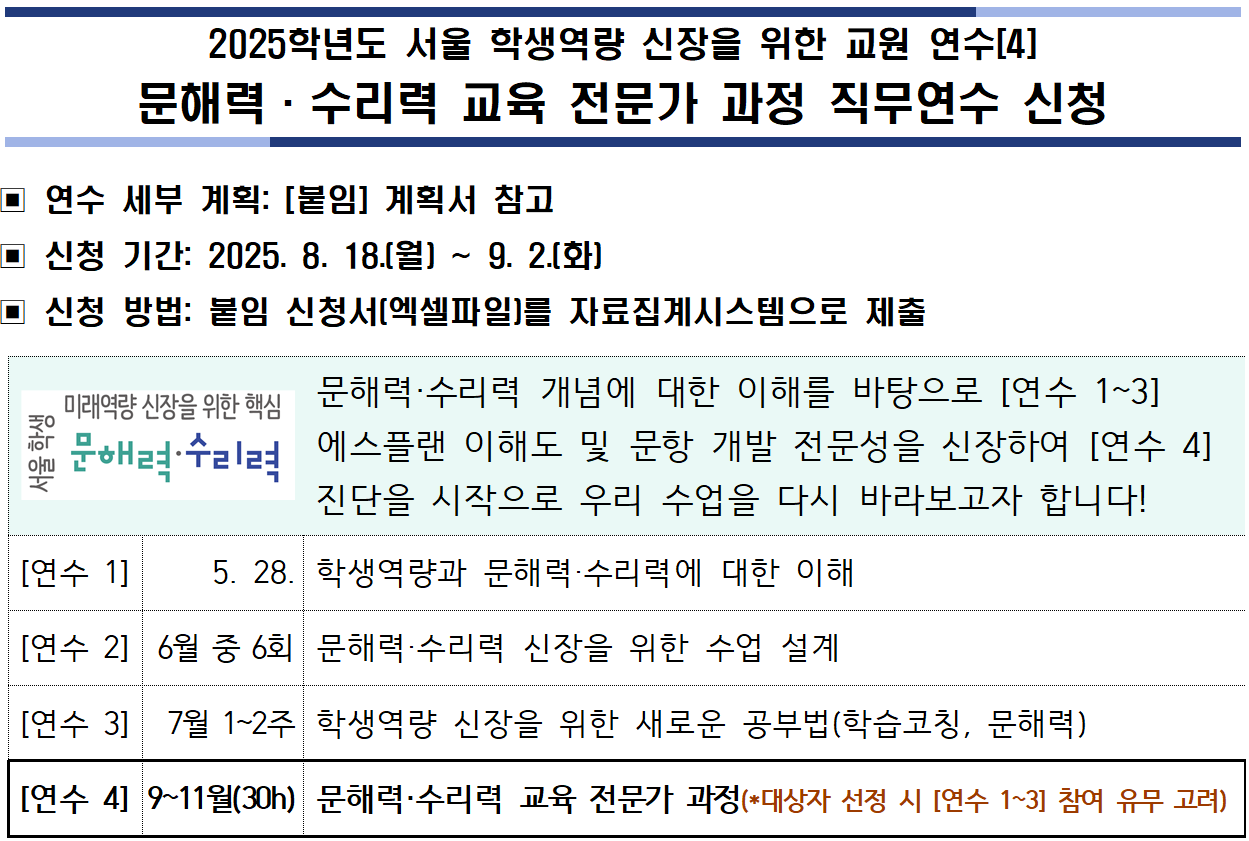 [연수 4] 2025학년도 서울 학생역량 신장을 위한 교원 연수-문해력수리력 교육 전문가 과정 직무연수-운영 계획(학교 안내).pdf